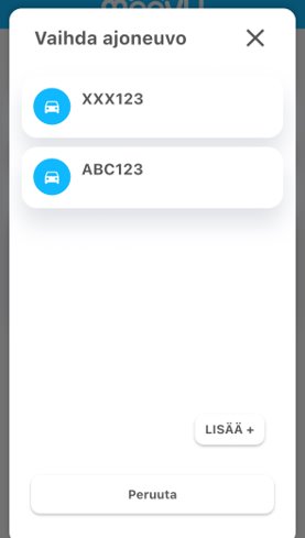 Tekstiä klikkaamalla aukeaa valikko, jossa on näkyvillä kaikki sovellukseen lisätyt ajoneuvot. Halutessasi voit lisätä uuden ajoneuvon klikkaamalla Lisää + -painiketta.